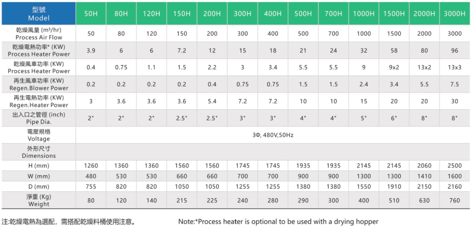 KF-H系列蜂巢转轮除湿机主要用来对吸湿性较强的工程塑胶进行高效率的除湿作业。本公司所采用的蜂巢转轮在理想状态下露点可达到-40°C;全系列采用P.1.D温控系统为标准装备,另提供PLC控制搭配LCD触控式人机界面供选购,提供可即时监控机器除湿效果的露点计供选配,该系列产品共有14种机型,最大干燥风量可达4000m3/hr。