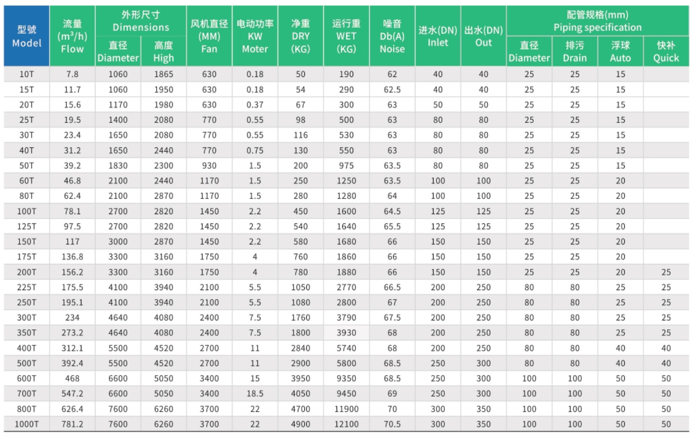 冷却塔主要应用于空调冷却系统、冷冻系列、注塑、制革、发泡、发电、汽轮机、铝型材加工、空压机、工业水冷却等领域,应用最多的为空调冷却、冷冻、塑胶化工行业。作用是将携带废热的冷却水在塔体内部与空气进行热交换,使废热传输给空气并散入大气中。